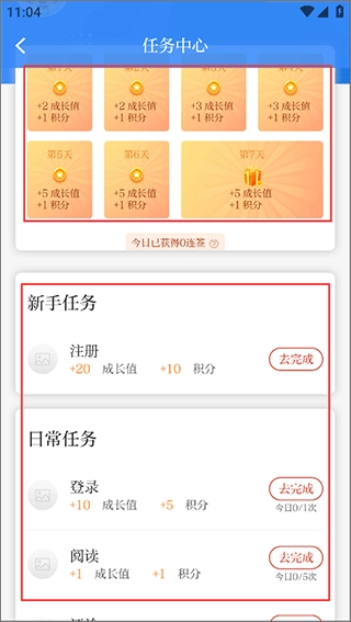 3、进入页面后,系统会提示用户签到成功,签到能获得积分,下方的日常任务也可获取积分,这些积分可在积分商城兑换物品。