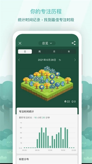 3、你的专注森林——你的学习记录与专注时长都将化作一片可爱的森林,为你带来满满的成就感!