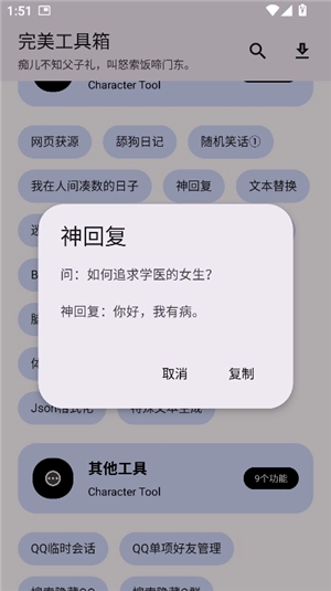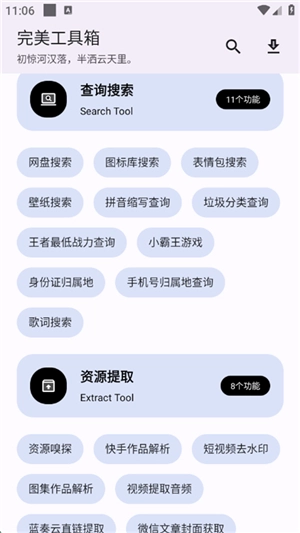 完美工具箱是一款资源丰富的实用小工具合集软件,它具备短视频解析、资源嗅探、音乐搜索、网盘搜索、小霸王等众多特色功能,此外还包含指南针、水平仪、量角器、刻度尺等十几种生活常用小工具,日常遇到问题时都能在这里找到合适的工具来解决,不愧是名副其实的完美工具箱。