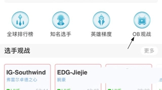 2、找到图中所示位置的【OB观战】功能,点击该功能进入下一个界面。