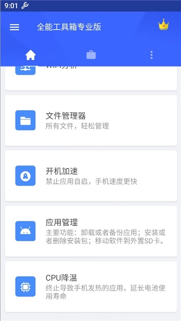 1、全能工具箱,打开后进入主界面,在该界面中点击“cpu降温”选项。
