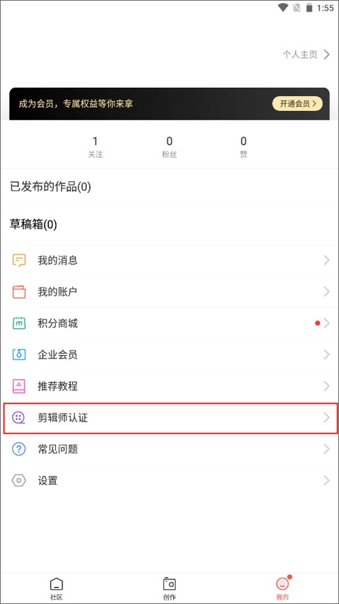 4、接下来只需发布自己的作品,满足剪辑师认证的要求,即可进行相应的认证操作。