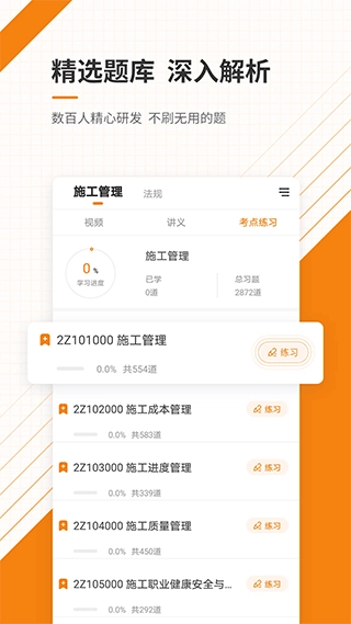 1、精选题库按科目分类,覆盖施工管理等多个领域的知识点,支持逐题练习,助力考生全面掌握考试内容。