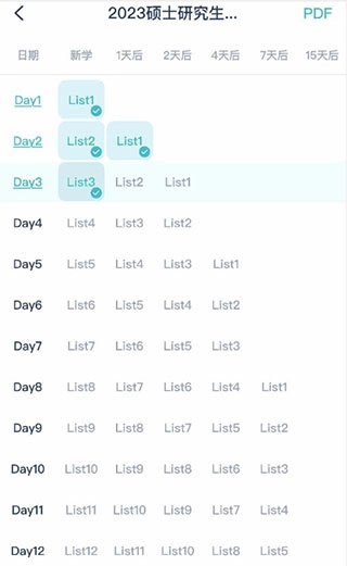 学习计划清单里,每一天的单词学习都包含记忆与复习两个环节。只有完成当天的记忆和复习任务,才能开启下一天的学习。打勾的项目代表对应的记忆或复习任务已完成。就像图中展示的那样,Day3已经完成了list3的记忆,但还需要复习list1和list2,之后才能进入Day4的学习阶段。