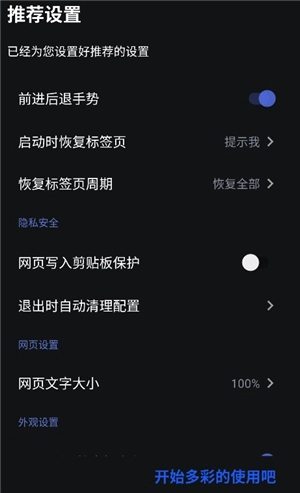 2、支持浏览多个网站,并且在退出后可以进行隐私清理与相关设置等操作