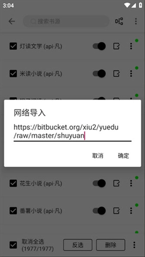 9、如图所示,能看到新添加的导入书源信息,我们把这些信息全部勾选后,点击右下角的【确认】按钮。