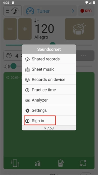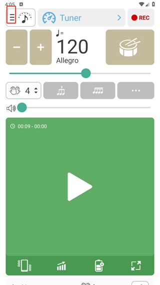 1、首先打开调音器和节拍器App,进入首页后点击左上角的【三横图标】;