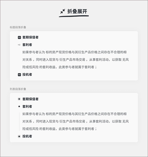 对于标题和列表类的段落,你可以点击段落前的小图标来折叠该段落。等需要查看详细内容时,再将其展开即可。