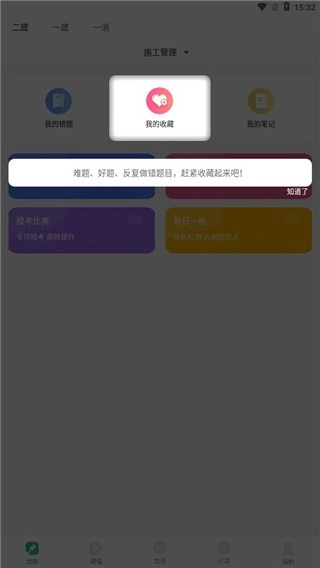 进入哇题库后,能看到一建、二建、一消的考试资料,用户可根据自身需求选择学习内容,平台内包含各类练习题与模考比赛。