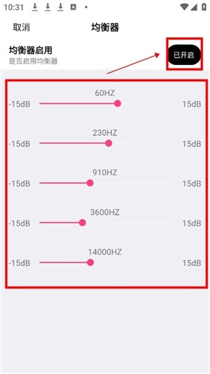 4、设置好均衡器数值后在右上角选择开启即可。