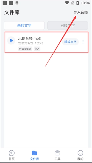 2、在“文件库”页面您能看到所有文件,要是需要转换的文件不在这个目录里,您还可以点击右上角的“导入音频”功能来导入。