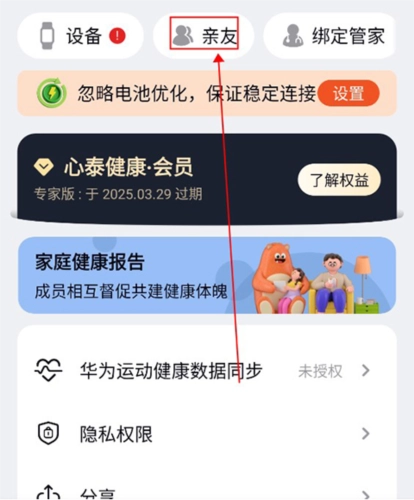 5. 拥有健康算法,就像在手腕上配备了人工智能“脉诊”,增强智能穿戴设备的实用性。1. 用户于个人中心处点击上方的“亲友”选项。