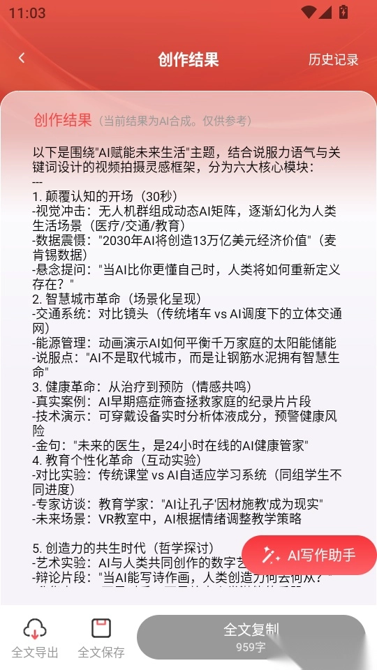 6. 接下来大家就能得到AI生成的创作成果,点击“全文导出”按钮即可完成保存。