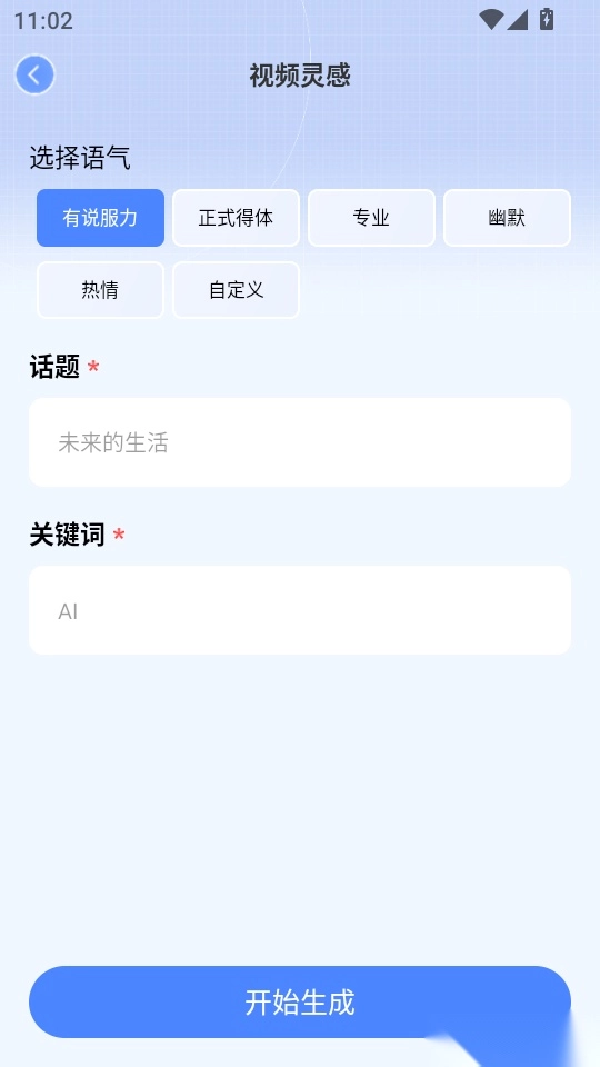 5. 接着,大家挑选好语气,输入话题与关键词,再点击“开始生成”按钮,就能进入到下一步操作。