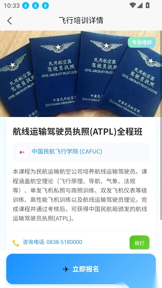 软件支持线上飞行培训服务,用户能够实时开展航空飞行培训,还可一键完成培训报名流程。