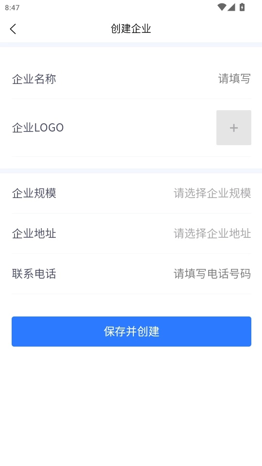 4. 填写企业名称并上传企业LOGO,选择企业规模、填写企业地址和电话号码,点击“保存并创建”按钮即可完成操作。