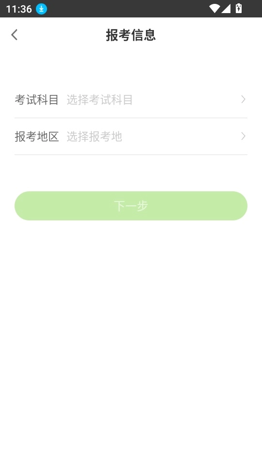 3、进入报考信息界面后,即可选择所需的考试科目与报考地,随后点击“下一步”按钮继续后续操作。