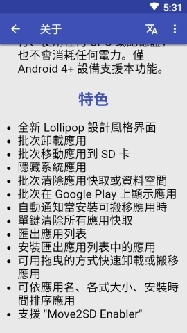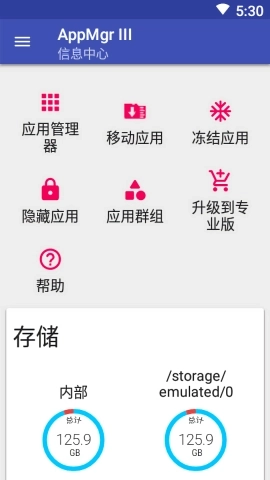 1、应用搬移:支持帮您把应用转移到SD卡,也能将其移回内部存储。