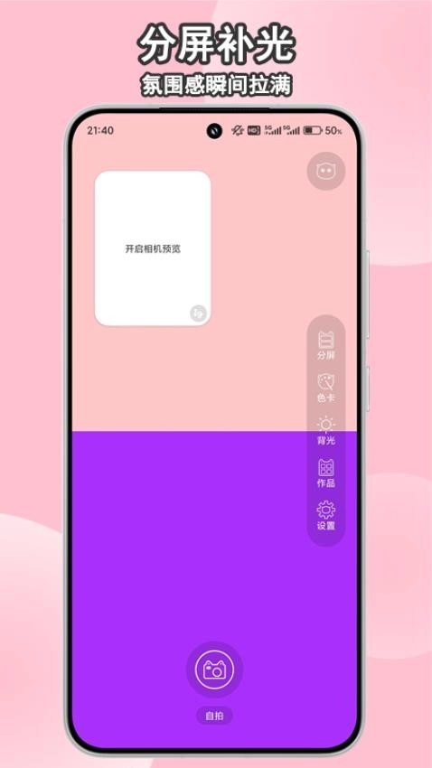 小猫补光灯自拍是一款能为用户提供智能调光补光功能的应用软件。它为用户准备了精美的补光特效,多种灯光色彩可供选择,帮助用户在线实现素颜补光,轻松拍出有质感的照片,让自拍补光变得简单,轻松拍摄出心仪的时尚大片。平台还支持用户在线进行分屏补光,用户可以打造自己的面色光影效果,在线调节多彩灯光颜色,便捷地选择色卡,从而营造出专属的氛围感。另外,小猫补光灯自拍还支持筛选独特的滤镜来展示效果,能轻松添加拍立得相框使用,有需要的用户快来本站体验吧!