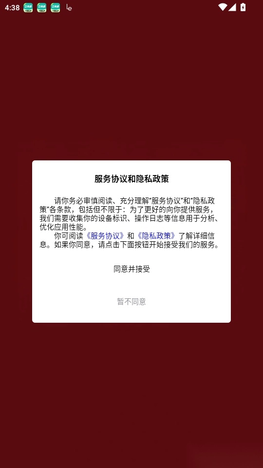 1. 打开软件后,阅读“服务协议和隐私政策”,点击“同意并接受”按钮进入应用。
