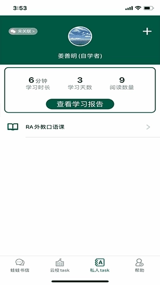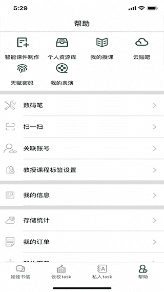 -主选项卡显示内容为:蛙蛙书信、私人任务、云校任务、帮助