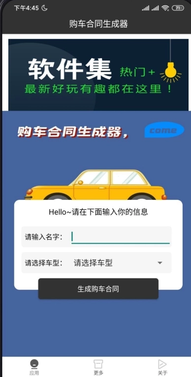 购车合同生成器是一款很受用户青睐的手机生成类软件,它能协助用户一键生成各类购车合同,无论是玛莎拉蒂、保时捷还是法拉利的购车合同都能轻松搞定,绝对是一款超实用的装13神器,感兴趣的用户们,别犹豫啦,快来体验吧。