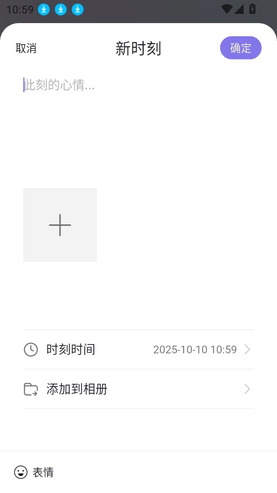 5、这样就能输入当下的心情时刻内容,点击“方框+”上传图片,然后点击“确定”按钮完成记录。