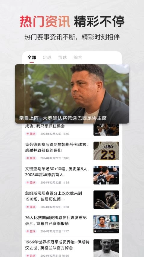 无论你想实时追踪比赛,还是阅读体育赛事的新闻资讯,都能在这里找到满意的答案。