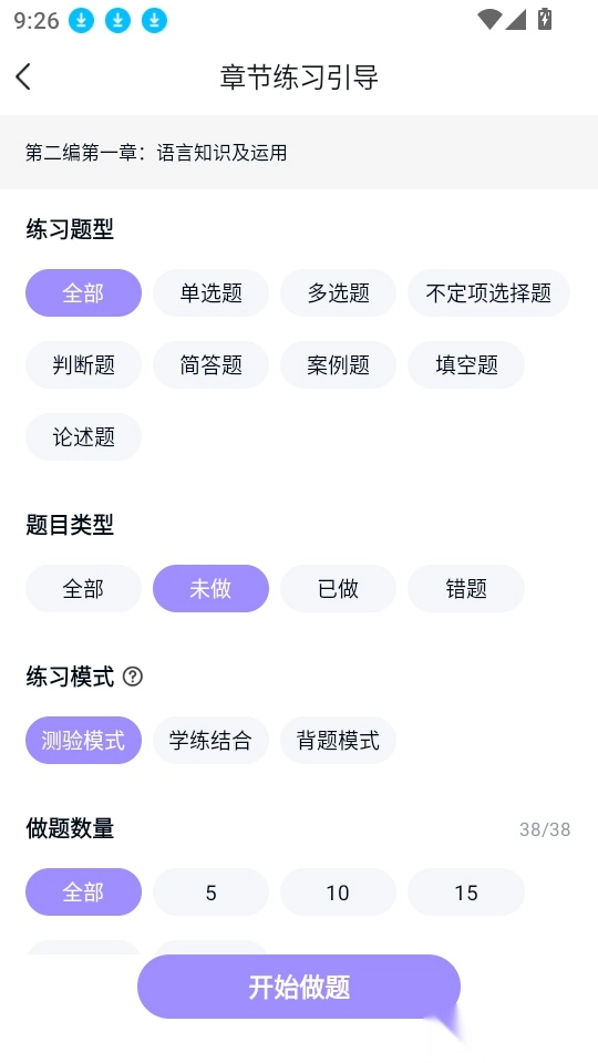 6、即可查看章节练习引导,对题目类型和练习模式进行选择,点击“开始做题”按钮进入下一步。