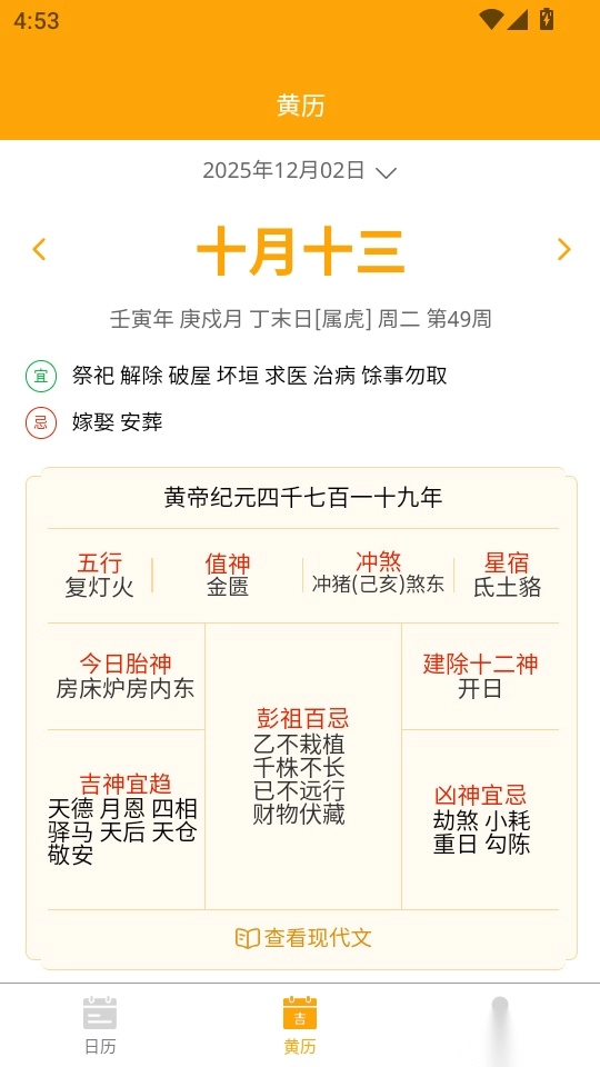 4. 接着在“黄历”菜单页面,点击底部的“查看现代文”按钮,即可进入后续操作。