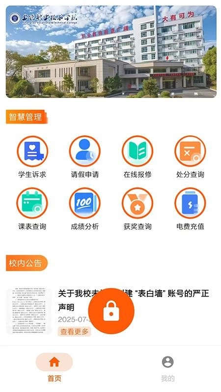 进入应用首页后,能看到丰富的管理功能,还可以浏览校内公告。