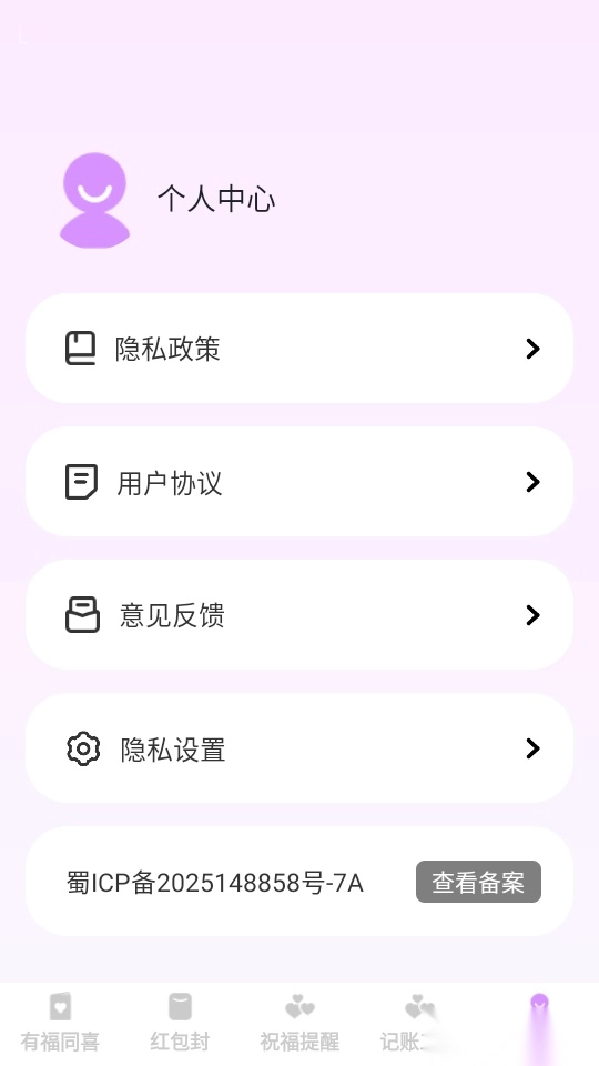 呈现了用户详尽的个人中心页面,能够查看相关的隐私协议,还可以便捷地反馈个人意见。
