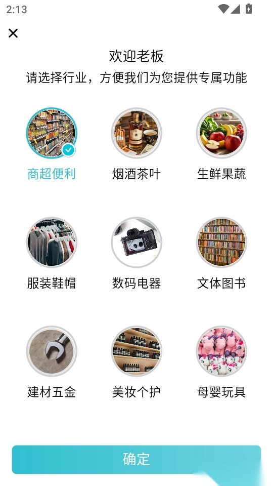 5、进入欢迎老板的界面后,选择所属的行业,点击“确定”,即可进入下一步操作。