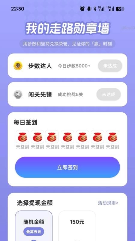 “走路我能赢”是一款创新的运动步数与趣味挑战结合的应用。用户每日行走积累的步数,既能用于解锁关卡——比如第1关需要100步、第2关需要300步,参与成语挑战赢红包;还能关联“步数达人(今日步数5000+)”“闯关先锋(成功挑战5关)”等勋章获取,用步数和坚持兑换荣誉。此外,应用设有每日签到领红包福利,用户可在“我的”页面查看现金金额并提现,同时提供隐私安全保障、政策协议说明及用户反馈渠道,让运动既有趣味又具实用价值,激励用户走出健康、收获奖励。