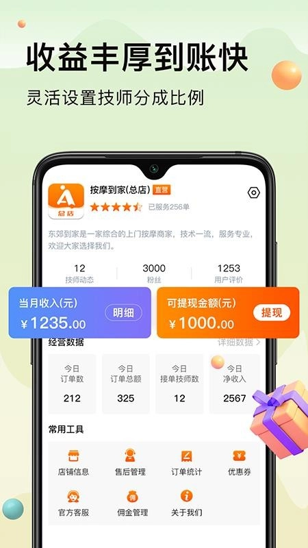 2、自家的按摩门店也能轻松打理,经营办公更便捷,一键即可完成管理。