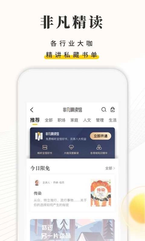 【非凡精读】(非电子书、有声书)采用全品类、多元化、分级阅读的全新阅读模式,馆内汇聚余秋雨、徐英瑾、刘蔚涛、康妮、崔玉涛等众多一线名师专家。其书籍解读品类涵盖40多个知识领域,从入门、进阶到精通,构建系统化分级学习方案,是终身成长者的理想听书馆。