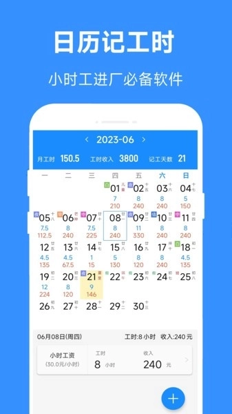 5、直观日历,一目了然:以日历视图呈现,可快速查阅每月工时与收入情况,助力更有序地进行管理。