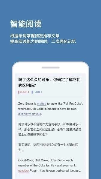 依据单词的掌握情况智能推送英文文章,在提升阅读能力的同时,对单词记忆进行二次巩固