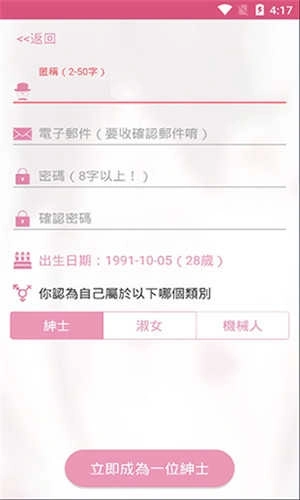 3、在注册页面依次填写名称、电子邮箱、密码、出生日期等信息,并在注册类别选项中选择【绅士】这一项。