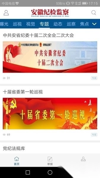 客户端专注于及时、准确、权威地发布安徽省党风廉洁建设和反腐败工作的相关信息,同时接通了省纪委监察厅举报网站,支持用户通过移动端开展实时举报。在设计风格上,它与网站保持统一,主要采用政务蓝和赭红作为主色调,并开设了要闻、审查、曝光、巡视、视觉、观点、专题、动态以及杂志等众多栏目。