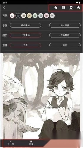 3、进入阅读界面后,再次点击屏幕会弹出多个选项,下方的选项用于控制页面翻页,上方则设有收藏、书架、设置和首页按钮。要是对当前界面不满意,还能更换背景、调整字体大小等。