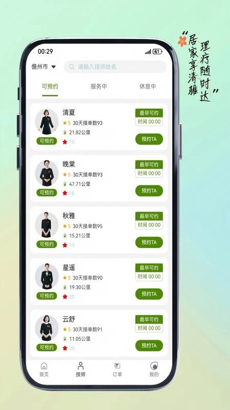 你可以实时查看清晰的技师列表,筛选附近的技师轻松预约,并查看技师的详细信息。