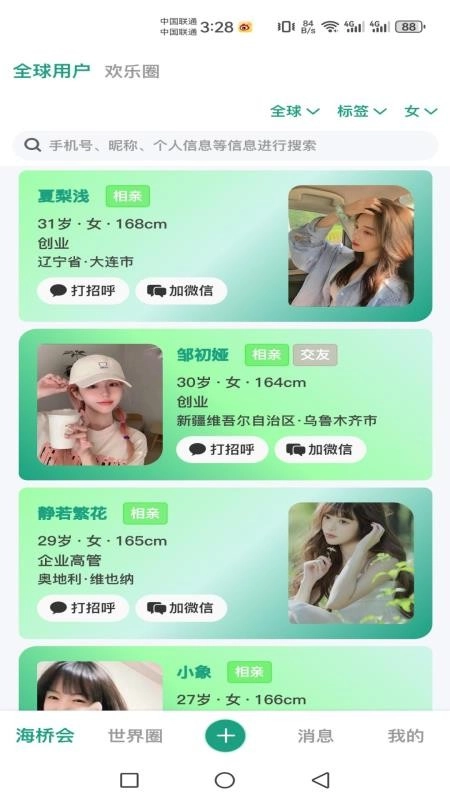 2、浏览全球用户列表,能自主搜索到拥有相同兴趣爱好的人,在线向他们打招呼并展开互动;