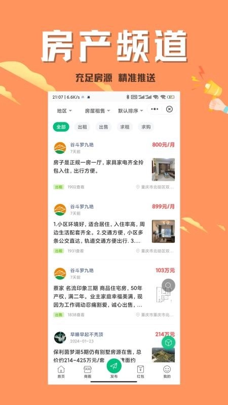 3、进入房产频道,可自由浏览并查找心仪的房源,方便后续联系与租房事宜。