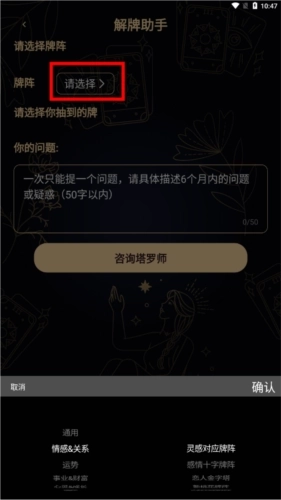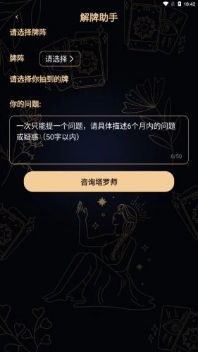 2、解牌助手:为了帮助塔罗初学者和爱好者在实践中掌握解牌技巧,我们专门开发了解牌助手功能。使用时,只需先选择合适的牌阵,接着挑选对应的牌,再输入具体问题,就能获取该牌的含义解读。