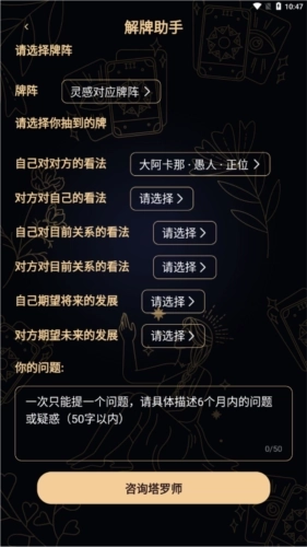 4、选择抽到的牌,填写你的问题,一键咨询