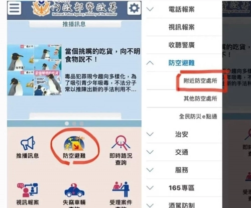打开首页后,就能看到防空避难的选项,点击该选项后,Google地图会显示附近的避难点。另外,也可以点击左上角的列表,找到防空避难栏位,再点击附近防空处所,同样能跳转到Google地图。找到最近的防空洞后,可查看其地址、容纳人数等信息,然后通过导航前往避难处。