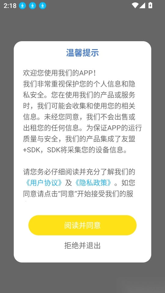 1、首先打开应用点击“阅读并同意”按钮来进入中。