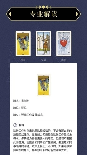 塔罗牌本身带有神秘色彩,用户通过抽取卡牌,系统会依据所选卡牌给出解读。这款软件就具备这样的功能,用户可自行体验。此外,你还能查询当日、次日、本周、本月乃至本年在爱情、事业、婚姻、健康等方面的运势,这能在你面临抉择困境时提供方向,给出建设性建议和专业解答。