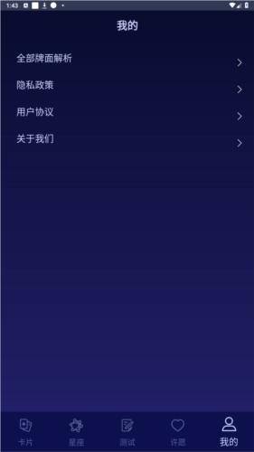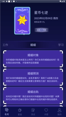 1、【卡片】页面:支持查看当日塔罗牌,所有用户均可访问该页面,通过它能够了解自身在工作、婚姻、学习、人际以及健康方面的情况;